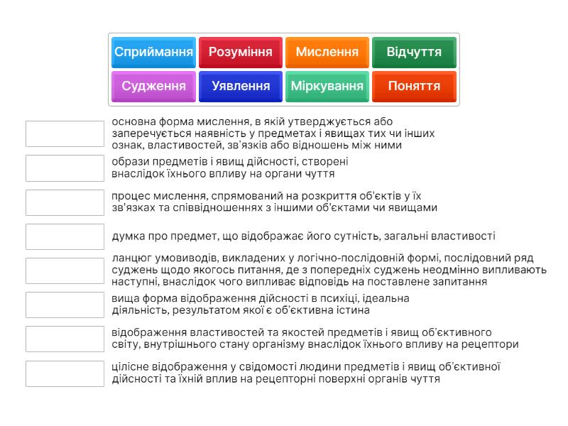 Мислення - вища форма відображення дійсності в психіці, ідеальна діяльність, результатом якої є об’єктивна істина, Судження - основна форма мислення, в якій утверджується або заперечується наявність у предметах і явищах тих чи інших ознак, властивостей, зв’язків або відношень між ними, Міркування - ланцюг умовиводів, викладених у логічно-послідовній формі, послідовний ряд суджень щодо якогось питання, де з попередніх суджень неодмінно випливають наступні, внаслідок чого випливає відповідь на поставлене запитання, Відчуття - відображення властивостей та якостей предметів і явищ об’єктивного світу, внутрішнього стану організму внаслідок їхнього впливу на рецептори, Сприймання - цілісне відображення у свідомості людини предметів і явищ об’єктивної дійсності та їхній вплив на рецепторні поверхні органів чуття, Уявлення - образи предметів і явищ дійсності, створені внаслідок їхнього впливу на органи чуття, Поняття - думка про предмет, що відображає його сутність, загальні властивості, Розуміння - процес мислення, спрямований на розкриття об'єктів у їх зв'язках та співвідношеннях з іншими об'єктами чи явищами,