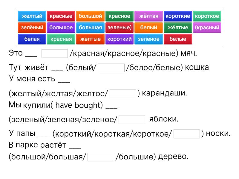 Это ___ ____/красная/красное/красные) мяч. Тут живёт ___ (белый/____/белое/белые) кошка У меня есть ___ (желтый/желтая/желтое/____) карандаши. Мы купили( have bought) ___ (зеленый/зеленая/зеленое/____ яблоки. У папы ___ (короткий/короткая/короткое/____) носки. В парке растёт ___ (большой/большая/____/большие) дерево.