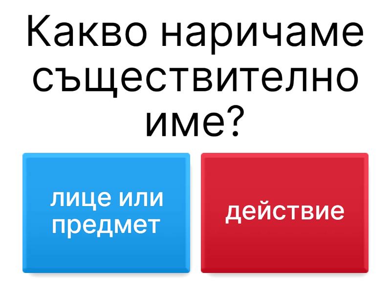 1) Какво наричаме съществително име? a) лице или предмет b) действие 2) Кое от изброените НЕ е граматическа категория на съществителното име? a) Род b) Число c) Определеност d) Време 3) Кое от изброените е граматическа категория на съществителното име? a) Наклонение b) Род c) Време d) Залог 4) Коя от думите е съществително име? a) Топка b) Красиво c) Навън d) Цвете 5) С кой въпрос намираме съществителното име? a) Кой е това? b) На кого е това? c) Какво прави? d) Какво е това?