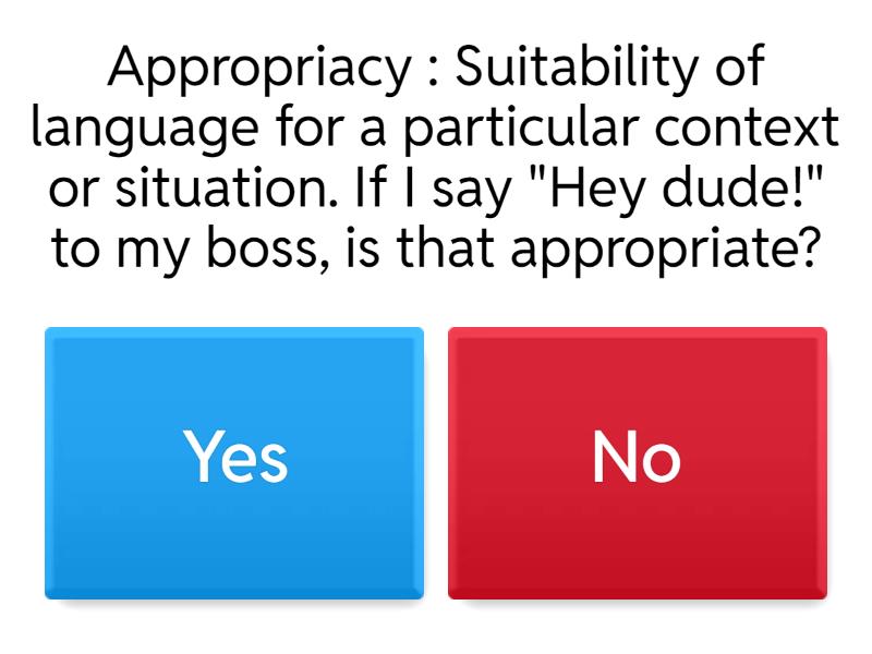 1) Appropriacy : Suitability of language for a particular context or situation. If I say "Hey dude!" to my boss, is that appropriate? a) Yes b) No 2) Is "Good morning, sir" more appropriate for a teacher or a close friend? a) a teacher b) close friend 3) Does appropriacy depend on who I’m talking to? a) Yes b) No 4) Formal Language : Language used in serious or official situations. Would you say "I would be grateful if you could help me" to your best friend? a) Yes b) No 5) Is formal language more common in job interviews or at a birthday party? a) Job interviews b) birthday party 6) Informal Language: Casual language used with friends or in relaxed situations. if I say “What’s up?” to my teacher, is that informal? a) Yes b) No 7) Would you write an email to your boss with “LOL”? a) Yes b) No 8) Neutral Language: Language that is neither very formal nor very informal. Is “Can I help you?” neutral, formal, or informal? a) Neutral b) Formal c) Informal 9) Is neutral language okay for speaking to someone you don’t know very well? a) Yes b) No 10) Is “Shall we begin?” a neutral way to start a lesson? a) Yes b) No 11) Function: The purpose for which language is used, e.g., requesting, apologizing, suggesting. If I say “Could you open the window?”, what am I doing? a) making a suggestion b) requesting 12) If I say “Sorry I’m late,” what’s the function? a) apologizing b) requesting 13) Context: The situation in which language is used, including who is speaking, where, and why. If you talk to your teacher in class, is that the same context as texting your friend? a) Yes b) No 14) Can context help us decide if language should be formal or informal? a) Yes b) No 15) If I’m in a business meeting, will I use the same words as at a party? a) Yes b) No