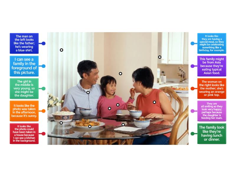 I can see a family in the foreground of this picture., It looks like the photo could have been taken in a house because I can see a kitchen in the background., It looks like the photo was taken in the afternoon, because it's sunny., The family look like they're having lunch or dinner., They are all smiling so they look very happy; perhaps because the daughter is feeding her mum., The man on the left looks like the father; he's wearing a blue shirt., The girl in the middle is very young, so she might be the daughter., The woman on the right looks like the mother; she's wearing an orange or pink top., This family might be from Asia because they're eating typical Asian food., It looks like they are having a special meal, so they might be celebrating something like a birthday, for example..