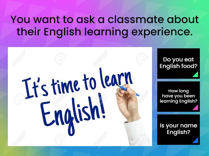 1) You want to ask a classmate about their English learning experience. a) Do you eat English food? b) How long have you been learning English? c) Is your name English? 2) You are online and want to know the size of a T-shirt. What should you ask? a) What colour is it? b) Where is the shop? c) What size is it? 3) You are in a new city and need to find the post office. What do you say? a) Excuse me, do you speak German? b) Excuse me, how can I get to the post office? c) Excuse me, where is your hotel? 4) You want to know the meaning of the word “reliable.” What question is correct? a) What does “reliable” mean? b) How do you spell “reliable”? c) Can I borrow your pen? 5) You want to try on some jeans in a shop. What do you say? a) Do you sell oranges? b) Can I try these jeans on, please? c) Do you have pizza? 6) You’re choosing a present and need help. What do you ask the shop assistant? a) What is your name? b) Can you help me choose a present? c) Where are the chairs? 7) You are at the airport and can’t find your gate. What should you ask? a) Excuse me, where is Gate 4? b) Do you fly often? c) Is this a shop? 8) You are messaging a friend and want to know their favorite English word. What do you ask? a) How many languages do you speak? b) What is your favourite English word? c) Do you like cats? 9) You want to know how to improve your speaking skills. What’s the best question? a) How can I speak better English? b) Do you like speaking English? c) Is English your favourite subject? 10) You are in a lesson and don’t understand a task. What should you ask the teacher? a) Can I leave now? b) What do we have to do? c) Do you like English?