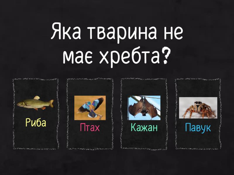 1) Яка тварина не має хребта? a) Риба b) Птах c) Кажан d) Павук 2) Як гадаєш, наступне твердження правда чи брехня? Павуки - це безкрилі комахи a) Так b) Ні 3) Які тварини-перші жителі суходолу? a) Птахи b) Риби c) Павуки d) Комахи 4) Чим риби дихають? a) Зябрами b) Ротом c) Плавниками d) Хвостом 5) Температура тіла земноводних залежить від температури довкілля? a) Так b) Ні 6) Чи всі птахи літають? a) Так b) Ні 7) Які особливості теплокровних тварин? a) не контролюють температуру свого тіла b) контролюють температуру свого тіла, але не постійно c) контролюють температуру свого тіла за рахунок регулювання швидкості обміну речовин. 8) Рослина-це… a) Живий організм b) Не живий організм 9) Вкажи органи, які має квіткова рослина a) корінь, стебло, листки, квітка, плід з насінням b) корінь, стебло, листки, плоди з насінням c) стебло, листки, квітки 10) Гриби відносяться до групи… a) Рослини b) Тварини c) Окрема група 11) Бактерій в організмі людини… a) більше, ніж клітин b) менше, ніж клітин c) так само як і клітин 12) Віруси без живої істоти жити можуть? a) Так b) Ні 13) З чого складається тверді речовини, рідини і газ? a) із крихітних частинок b) із одної великої частини c) із середніх частинок d) з декількох частинок 14) Від чого залежить стан речовини(твердий, рідкий, газоподібний)? a) Від солі b) Від температури c) Від їжі 15) Атмосфера-це a) кам’яна оболонка Землі b) водна оболонка Землі c) повітряна оболонка Землі 16) Літосфера-це a) кам’яна оболонка Землі b) повітряна оболонка Землі c) водна оболонка Землі 17) Гідросфера-це a) повітряна оболонка Землі b) кам’яна оболонка Землі c) водна оболонка Землі 18) Що всередині Землі? a) Земна кора b) Мантія c) Зовнішнє ядро d) Внутрішнє ядро 19) Як утворюється цунамі? a) Від тріщін на суходолі b) Від опускання плит c) Від землетрусу або виверження вулкана на дні океану 20) Скільки сторон світу (основні та проміжні)? a) 8 b) 3 c) 4 d) 10 21) Яка легенда пов’язана з Черніговом? a) У давні часи на територіях, де розташований Чернігів, росли дрімучі, «чорні» ліси. b) У давні часи на територіях, де розташований Чернігів, були піски з скарбами. c) У давні часи на територіях, де розташований Чернігів, були болота з магічними деревами 22) Яке Українське місто наукових відкриттів? a) Львів b) Харків c) Дніпро d) Київ 23) З відки надходять гроші до бюджету? a) з податків b) з неба c) з грошей d) з-за кордону 24) Україна-демократична країна? a) Так b) Ні