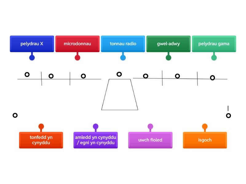 tonnau radio, microdonnau, isgoch, gwel-adwy, uwch fioled, pelydrau X, pelydrau gama, tonfedd yn cynyddu, amledd yn cynyddu / egni yn cynyddu.