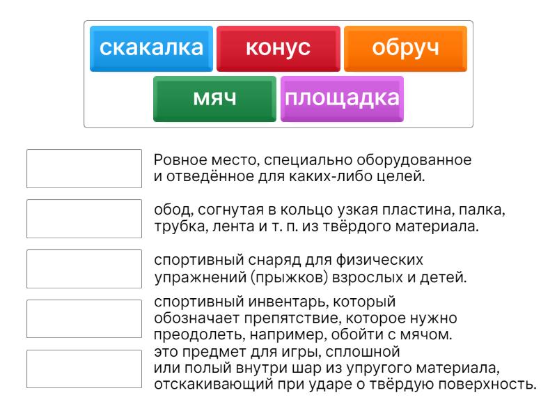 мяч - это предмет для игры, сплошной или полый внутри шар из упругого материала, отскакивающий при ударе о твёрдую поверхность., площадка - Ровное место, специально оборудованное и отведённое для каких-либо целей., обруч - обод, согнутая в кольцо узкая пластина, палка, трубка, лента и т. п. из твёрдого материала., скакалка - спортивный снаряд для физических упражнений (прыжков) взрослых и детей., конус - спортивный инвентарь, который обозначает препятствие, которое нужно преодолеть, например, обойти с мячом.,