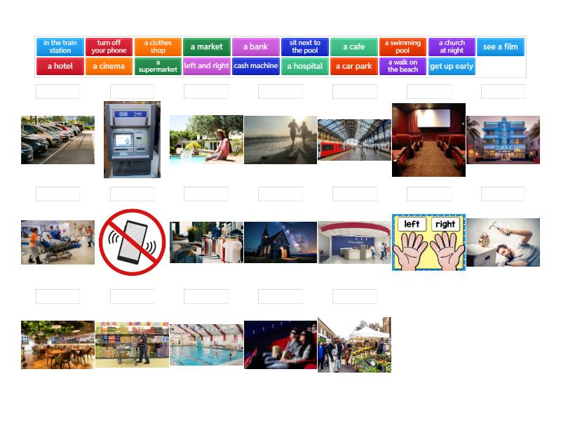 a walk on the beach, turn off your phone, get up early, see a film, left and right, sit next to the pool, in the train station, cash machine, a church at night, a bank, a cafe, a car park, a cinema, a clothes shop, a hospital, a hotel, a market, a supermarket, a swimming pool,