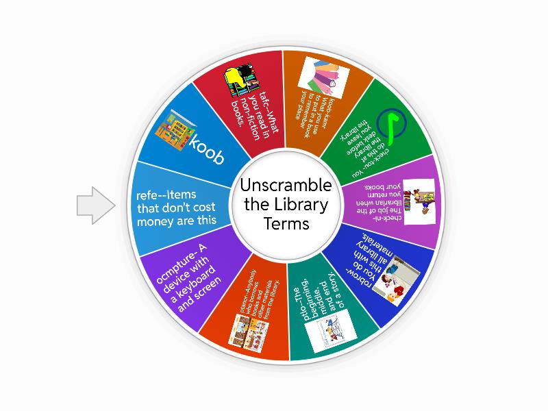 koob, tafc--What you read in non-fiction books. , koob-kamr What you use to put in a book to remember your place, check-tou- You do this at the library desk before you leave the library. , check-ni- The job of the librarian when you return your books. , robrow- You do this with all library materials. , ptlo--The beginning, middle, and end of a story. , ptanor--Anybody who borrows books and other materials from the library. , ocmpture- A device with a keyboard and screen, refe--Items that don't cost money are this .