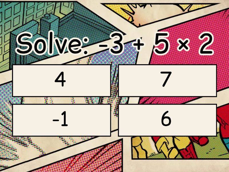 1) Solve: -3 + 5 × 2 a) 4 b) 7 c) -1 d) 6 2) Solve: 6 ÷ 2 - 4 a) -1 b) 1 c) 3 d) -2 3) Solve: 8 - 3 × 2 a) 2 b) 10 c) -2 d) -10 4) Solve: 10 + (-2) × 3 a) 7 b) 16 c) 4 d) -4 5) Solve: -5 × 2 + 3 a) -8 b) -10 c) -7 d) 7 6) Solve: 9 ÷ 3 + 4 a) 8 b) 3 c) 7 d) -7 7) Solve: -8 + 12 ÷ 4 a) -1 b) -5 c) -2 d) 5 8) Solve: 15 - 3 × 4 a) 1 b) 3 c) 9 d) -3 9) Solve: 7 + (-3) × 2 a) 8 b) 13 c) 1 d) -1 10) Solve: -6 ÷ 2 + 5 a) 4 b) 8 c) 2 d) -2 11) Solve: 4 × (-2) + 9 a) 8 b) 1 c) -5 d) -1 12) Solve: 18 ÷ (-3) + 2 a) 4 b) -4 c) 8 d) -8 13) Solve: 5 - (-3) × 2 a) 12 b) 5 c) 11 d) -11 14) Solve: 4 + 6 × (-1) a) 2 b) 10 c) -2 d) -6 15) Solve: -7 + 3 × 5 a) -8 b) -22 c) -2 d) 8 16) Solve: -9 + 4 × 3 a) 3 b) -21 c) -3 d) 21 17) Solve: 10 - 2 × 6 a) 2 b) -2 c) 8 d) 22 18) Solve: -4 × 3 + 7 a) 19 b) -5 c) 5 d) -19 19) Solve: -2 + 3 × 4 a) 12 b) -6 c) -10 d) 10