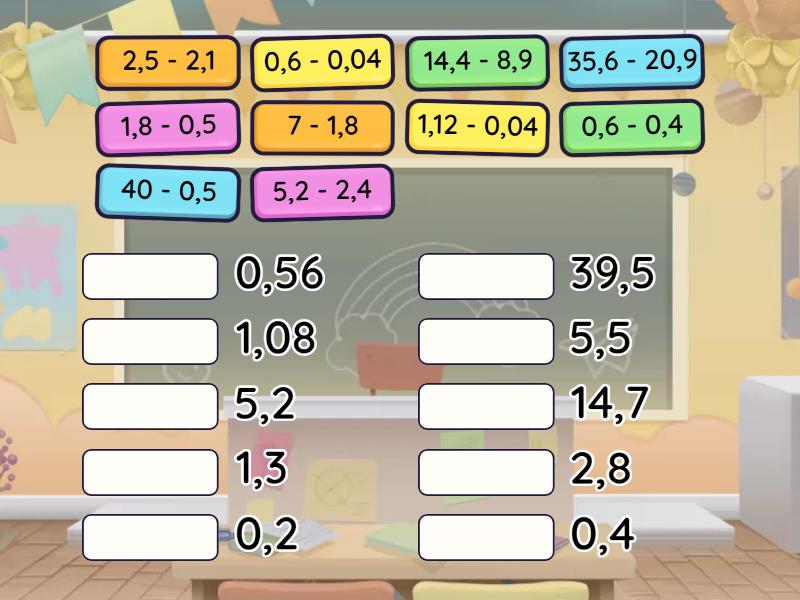 0,6 - 0,4 - 0,2, 1,8 - 0,5 - 1,3, 1,12 - 0,04 - 1,08, 0,6 - 0,04 - 0,56, 2,5 - 2,1 - 0,4, 7 - 1,8 - 5,2, 5,2 - 2,4 - 2,8, 14,4 - 8,9 - 5,5, 35,6 - 20,9 - 14,7, 40 - 0,5 - 39,5,