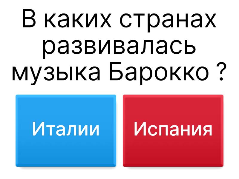 1) В каких странах развивалась музыка Барокко ? a) Италии b) Испания 2) В какой период появился стиль музыки Барокко ? a) С конца XVI -1-й половины XVIII века. b) Начало XX века c) XV век d) XII век 3) Сколько насчитано аффектов в согласно их теории ? a) 27 b) 12 c) 16 d) 6