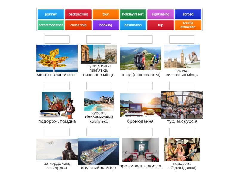 abroad - за кордоном, за кордон, backpacking - похід (з рюкзаком), cruise ship - круїзний лайнер, holiday resort - курорт, відпочинковий комплекс, sightseeing - огляд визначних місць, tourist attraction - туристична пам'ятка, визначне місце, accommodation - проживання, житло, booking - бронювання, destination - місце призначення, journey - подорож, поїздка (довша), tour - тур, екскурсія, trip - подорож, поїздка,
