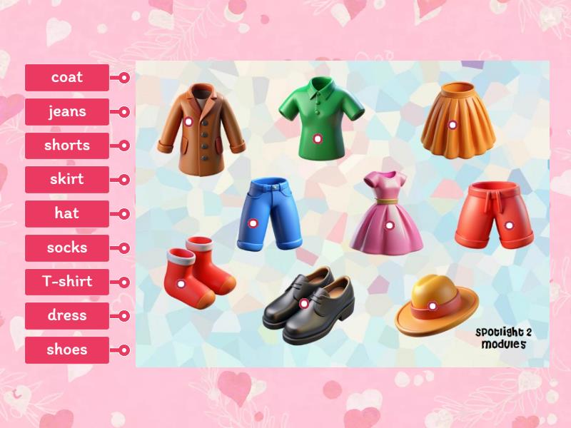 jeans, skirt, T-shirt, coat, socks, shoes, dress, hat, shorts.