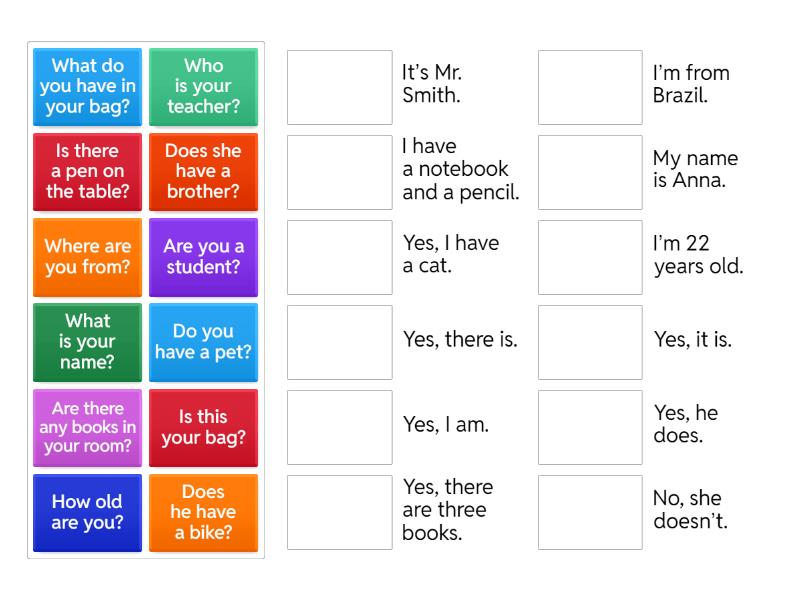 What is your name? - My name is Anna., Are you a student? - Yes, I am., Where are you from? - I’m from Brazil., Is this your bag? - Yes, it is., How old are you? - I’m 22 years old., Do you have a pet? - Yes, I have a cat., What do you have in your bag? - I have a notebook and a pencil., Does she have a brother? - No, she doesn’t., Is there a pen on the table? - Yes, there is., Are there any books in your room? - Yes, there are three books., Who is your teacher? - It’s Mr. Smith., Does he have a bike? - Yes, he does.,