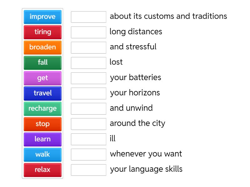 recharge - your batteries, relax - and unwind, broaden - your horizons, learn - about its customs and traditions, improve - your language skills, tiring - and stressful, get - lost, stop - whenever you want, travel - long distances, fall - ill, walk - around the city,