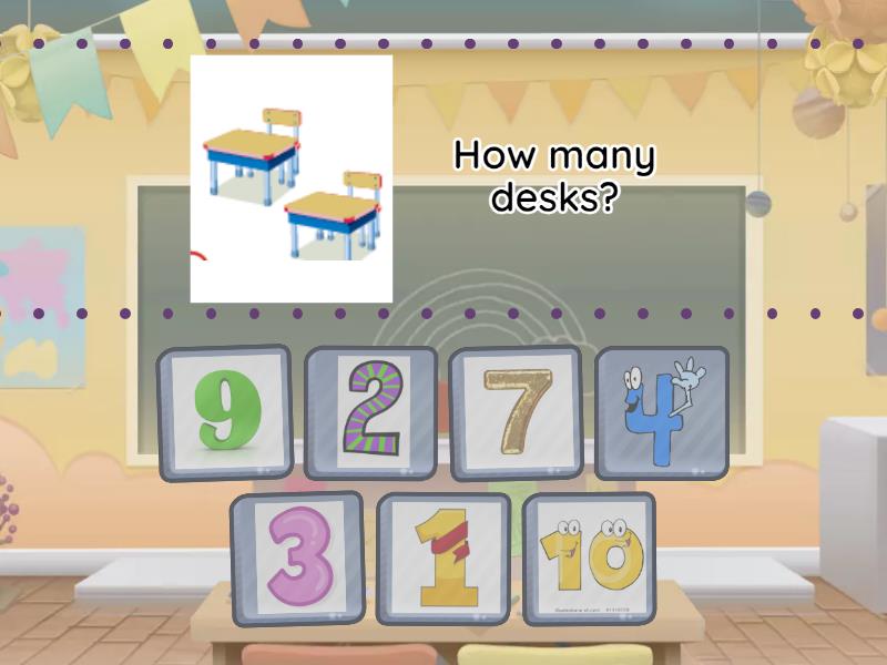How many desks?, How many bags?, How many pencils?, How many rubbers?, How many books?, How many chairs?, How many exercise-books?,