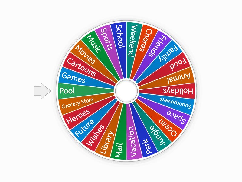 1) Games 2) Cartoons 3) Movies 4) Music 5) Sports 6) School 7) Weekend 8) Chores 9) Friends 10) Family 11) Food 12) Animal 13) Holidays 14) Superpowers 15) Space 16) Ocean 17) Jungle 18) Park 19) Vacation 20) Mall 21) Library 22) Wishes 23) Future 24) Heroes 25) Grocery Store 26) Pool
