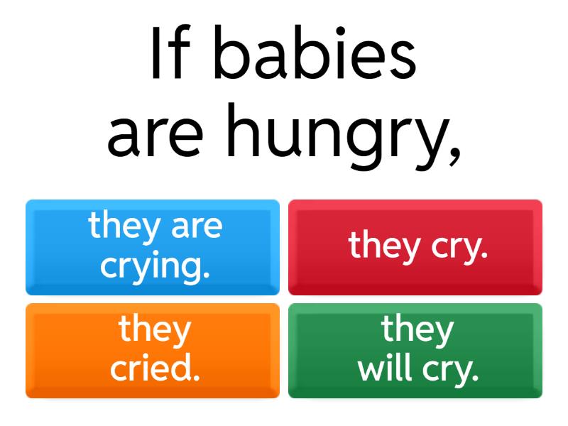 1) If babies are hungry,  a) they are crying. b) they cry. c) they cried. d) they will cry. 2) If you mix hydrogen and oxygen, a) you get water. b) you'll get water. c) you've got water. d) you're getting water. 3) If plants don't get enough water, a) they'll die. b) they are dying. c) they die. d) they've died 4) If we don't drink, a) we've got thirsty. b) we're getting thirsty. c) we'll get thirsty. d) we get thirsty. 5) If it rains, a) the ground is getting wet. b) the ground will get wet. c) the ground gets wet. d) the ground got wet. 6) If the temperature is high, a) the ice is melting. b) the ice melts. c) the ice has been melting. d) the ice melted. 7) If the sun shines, a) it gets warm. b) it is getting warm. c) it got warm. d) it will get warm. 8) If the sun goes down, a) it will be dark. b) it is dark. c) it has been dark. d) it was dark.