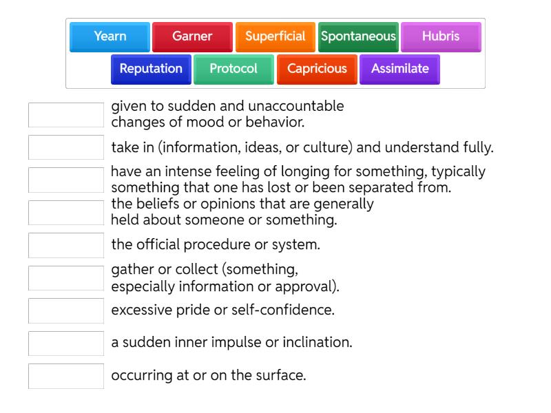 Superficial  - occurring at or on the surface., Spontaneous - a sudden inner impulse or inclination., Protocol - the official procedure or system., Capricious - given to sudden and unaccountable changes of mood or behavior., Reputation - the beliefs or opinions that are generally held about someone or something., Assimilate - take in (information, ideas, or culture) and understand fully., Garner - gather or collect (something, especially information or approval)., Yearn - have an intense feeling of longing for something, typically something that one has lost or been separated from., Hubris - excessive pride or self-confidence.,