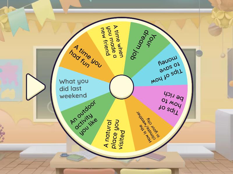 1) A time you had fun 2) A time when you made a new friend 3) Your dream job 4) Tips of how to save money 5) Tips of how to be rich 6) How is the climate/weather in your city 7) A natural place you visited 8) An outdoor activity you like 9) What you did last weekend
