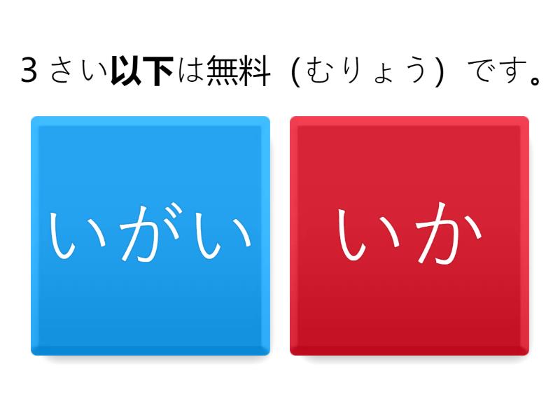 1) 3さい以下は無料(むりょう)です。 a) いがい b) いか 2) 八百屋へ買い物に行きます。 a) はおや b) やおや 3) わたしの家は学校から遠いです。 a) おとい b) とおい 4) となりの部屋(へや)から変(へん)な音が聞こえます。 a) おと b) うた 5) あのかばんは3万4千円です。 a) ばん b) まん 6) 今日は天気がわるいですね。 a) 寒い b) 悪い 7) リンさんは会社いんです。 a) 院 b) 員 8) この近くにえいがかんはありませんか。 a) 水族館 b) 映画館 9) 世かいで一番高い山は何ですか。 a) 回 b) 界 10) この言葉のい味を教えてください。 a) 意 b) 医 11) わたしには兄が一人います。 a) あに b) おに 12) マリアさんは去年、日本へ来ました。 a) きょうねん b) きょねん 13) ここは工業のさかんな町です。 a) こうじょう b) こうぎょう 14) 彼は黒いぼうしをかぶっています。 a) くろ b) くら 15) 今日の午後、銀行に行きます。 a) ぎん b) きん 16) きゅうにベルが鳴りました。 a) 急 b) 究 17) 学校はここからちかいです。 a) 遠い b) 近い 18) いつも家族のことをかんがえています。 a) 考がえて b) 考えて 19) このかばんかかるいです。 a) 軽い b) 強い 20) これはけんの建物です。 a) 研 b) 県
