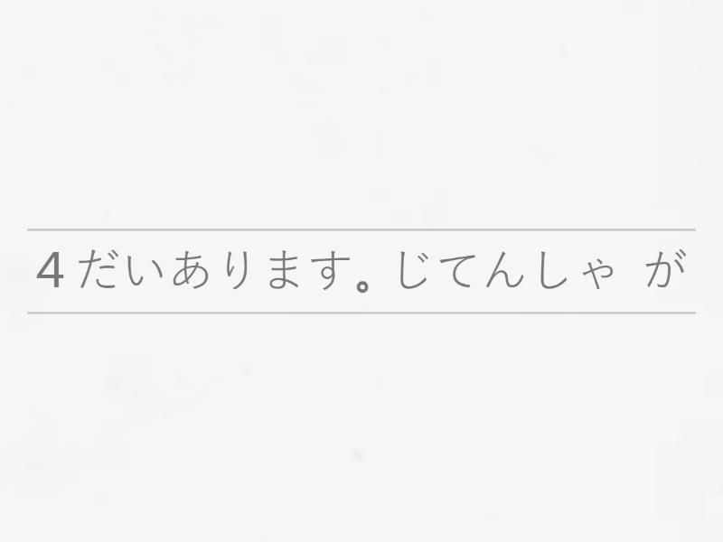 じてんしゃ が 4だいあります。, おさら が 2まいあります。, おとこのこ が ひとりいます。, おおきい かばん が ほしいです。, ぼうけんの ほん を よみました。, たまご を 2こたべます。, ジュース を 1ぽんのみました。, ねこ が 6ぴきいます。, くつ が 8そくあります。, ノート を 10さつかいました。,