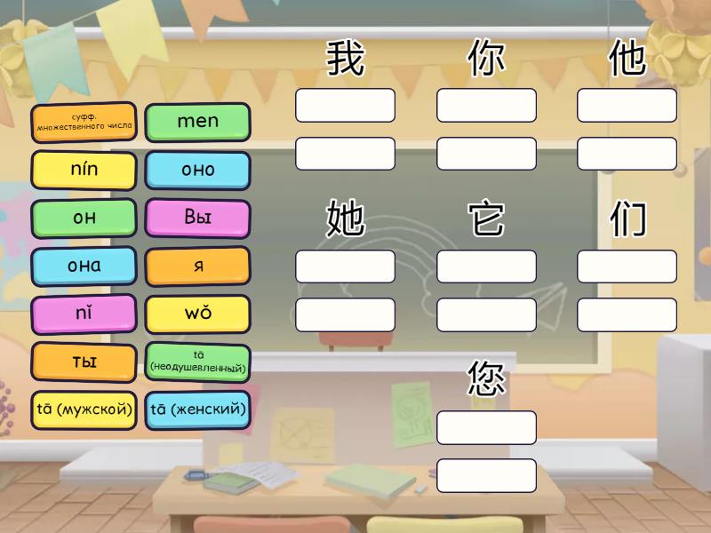 我: wǒ, я, 你: nǐ, ты, 他: tā (мужской), он, 她: tā (женский), она, 它: tā (неодушевленный), оно, 们: men, суфф. множественного числа, 您: nín, Вы,
