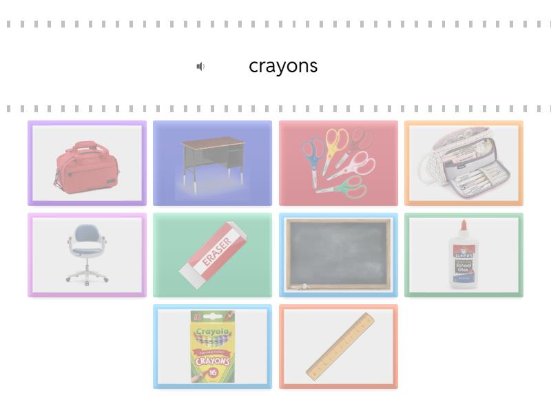 crayons, scissors, pencil case, glue, chair, desk, eraser, ruler, bag, blackboard,