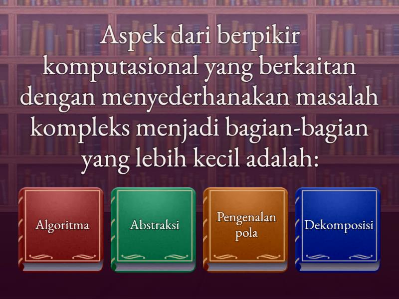 1) Aspek dari berpikir komputasional yang berkaitan dengan menyederhanakan masalah kompleks menjadi bagian-bagian yang lebih kecil adalah: a) Algoritma b) Abstraksi c) Pengenalan pola d) Dekomposisi 2) Bagaimana konsep "urutan langkah" (sequence) dalam penyusunan instruksi berkaitan dengan algoritma dalam tugas sehari-hari seperti "membuat kopi"? a) Setiap langkah harus dilakukan dalam urutan yang benar untuk mencapai hasil yang diinginkan, sama seperti algoritma. b) Algoritma hanya berlaku untuk instruksi komputer, bukan tugas sehari-hari. c) Urutan langkah tidak penting selama semua bahan tersedia. d) Instruksi yang baik harus memiliki banyak pilihan langkah yang bisa ditukar-tukar. 3) Dalam pengolahan data, proses normalisasi data berarti: a) Mengubah data kategori menjadi numerik b) Mengumpulkan data dari berbagai sumber c) Menghapus data duplikat d) Menyesuaikan nilai data ke dalam rentang tertentu (misalnya 0-1) 4) Metode pengumpulan data yang efisien bila peneliti mengetahui secara pasti, data atau informasi apa yang dibutuhkan dan bagaimana variabel yang menyatakan informasi yang dibutuhkan tersebut diukur adalah .... a) kuesioner b) observasi c) wawancara d) percobaan laboratorium 5) Apa yang dimaksud dengan diseminasi konten digital: a) b) c) d) 6) Apa yang dimaksud dengan konten digital? a) b) c) d) 7) Bagaimana cara mengevaluasi keberhasilan diseminasi konten artikel blog yang bertujuan meningkatkan brand awareness? a) b) c) d) 8) Jika tujuan utama diseminasi konten adalah membangun komunitas dan interaksi dua arah yang intens dengan audiens mengenai topik hobi tertentu, platform mana yang mungkin paling efektif? a) b) c) d)