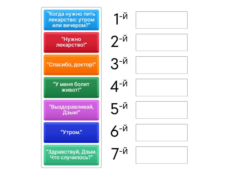 "Утром.", "Выздоравливай, Дзыи!", "У меня болит живот!", "Здравствуй, Дзыи. Что случилось?", "Спасибо, доктор!", "Нужно лекарство!", "Когда нужно пить лекарство: утром или вечером?".