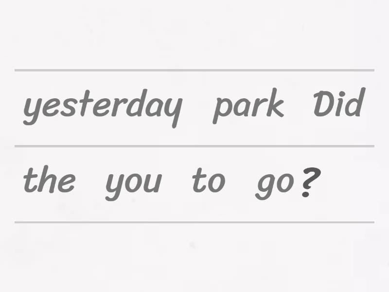 Did you go to the park yesterday?, Did she watch a movie last night?, Did they play football after school?, Did he visit his grandmother last weekend?, Did you eat breakfast this morning?, Did we arrive on time?, Did Peter call you yesterday?, Did she study for the test?, Did you see that new show?, Did they walk to school?, Did he sleep well last night?, Did your friend like the gift?, Did you clean your room?, Did she cook dinner last night?, Did it rain last Sunday?, Did they travel to Spain last year?, Did you enjoy the concert?, Did your teacher give homework?, Did we win the game?, Did she buy a new phone?, Did you read that book?, Did he fix his bike?, Did your parents go out?, Did they dance at the party?, Did you take a photo?, Where did you go on Saturday?, What did she eat for lunch?, When did they leave the house?, Where did he find the wallet?, What did you buy at the store?, When did she call you?, Where did they stay on vacation?, What did you watch last night?, When did the movie start?, Where did your friends meet?, What did he say to you?, When did you finish your homework?, Where did they have dinner?, What did she wear to the party?, When did he arrive at school?, Where did you see that jacket?, What did your mom cook yesterday?, When did you wake up today?, Where did they play football?, What did the teacher explain?, When did you go to sleep?, Where did she find that necklace?, What did you do on your birthday?, When did he visit his cousin?, Where did you lose your keys?,