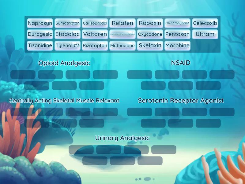 Opioid Analgesic: Hydrocodone/Acetaminophen, Methadone, Morphine, Oxycodone, Ultram, Duragesic, Tylenol #3, NSAID: Celecoxib, Voltaren, Etodolac, Relafen, Naprosyn, Centrally Acting Skeletal Muscle Relaxant: Carisoprodol, Skelaxin, Robaxin, Tizanidine, Serotonin Receptor Agonist: Sumatriptan, Rizatriptan, Urinary Analgesic: Pentosan, Phenazopyridine,