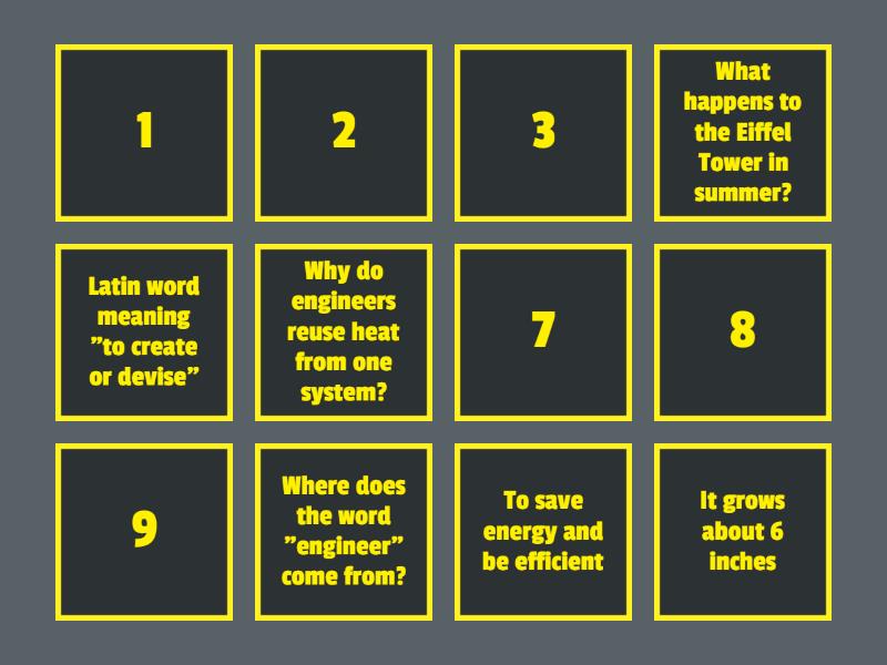 Where does the word "engineer" come from? - Latin word meaning "to create or devise", Why do engineers reuse heat from one system? - To save energy and be efficient, What happens to the Eiffel Tower in summer? - It grows about 6 inches, Engineers sometimes use fruit to learn about what? - Balance and building, What is one material used in the Eiffel Tower? - Iron, What does thermal expansion mean? - Things grow when they get hot,