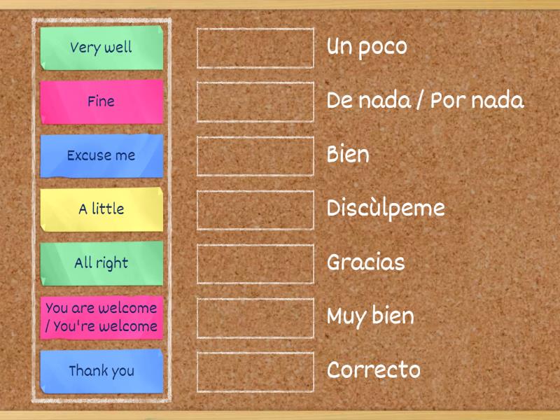 Thank you - Discùlpeme, You are welcome / You're welcome - Bien, All right - Un poco, Very well - Muy bien, Fine - Correcto, A little - Gracias, Excuse me - De nada / Por nada,