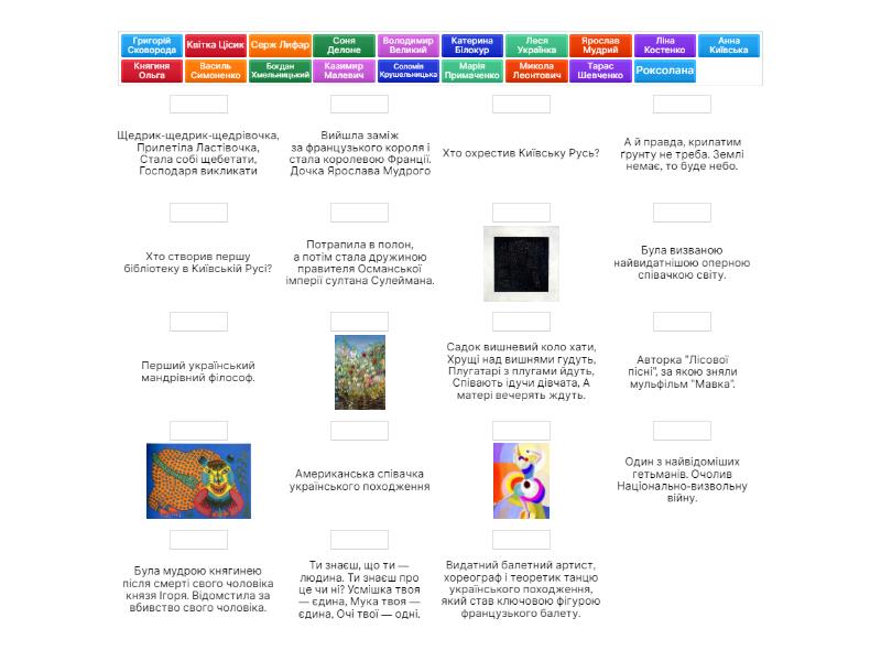 Володимир Великий - Хто охрестив Київську Русь?, Ярослав Мудрий - Хто створив першу бібліотеку в Київській Русі?, Катерина Білокур, Марія Примаченко, Казимир Малевич, Соня Делоне, Тарас Шевченко - Садок вишневий коло хати, Хрущі над вишнями гудуть, Плугатарі з плугами йдуть, Співають ідучи дівчата, А матері вечерять ждуть., Леся Українка - Авторка "Лісової пісні", за якою зняли мульфільм "Мавка". , Богдан Хмельницький - Один з найвідоміших гетьманів. Очолив Національно-визвольну війну., Анна Київська - Вийшла заміж за французького короля і стала королевою Франції. Дочка Ярослава Мудрого, Григорій Сковорода - Перший український мандрівний філософ., Княгиня Ольга - Була мудрою княгинею після смерті свого чоловіка князя Ігоря. Відомстила за вбивство свого чоловіка., Роксолана - Потрапила в полон, а потім стала дружиною правителя Османської імперії султана Сулеймана., Соломія Крушельницька - Була визваною найвидатнішою оперною співачкою світу., Микола Леонтович - Щедрик-щедрик-щедрівочка, Прилетіла Ластівочка, Стала собі щебетати, Господаря викликати, Квітка Цісик - Американська співачка українського походження, Серж Лифар - Видатний балетний артист, хореограф і теоретик танцю українського походження, який став ключовою фігурою французького балету., Ліна Костенко - А й правда, крилатим ґрунту не треба. Землі немає, то буде небо., Василь Симоненко - Ти знаєш, що ти — людина. Ти знаєш про це чи ні? Усмішка твоя — єдина, Мука твоя — єдина, Очі твої — одні.,
