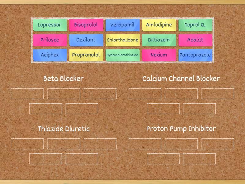 Beta Blocker: Bisoprolol, Lopressor, Toprol XL, Propranolol, Calcium Channel Blocker: Amlodipine, Adalat, Verapamil, Diltiazem, Thiazide Diuretic: Chlorthalidone, Hydrochlorothiazide, Proton Pump Inhibitor: Prilosec, Pantoprazole, Nexium, Dexilant, Aciphex,