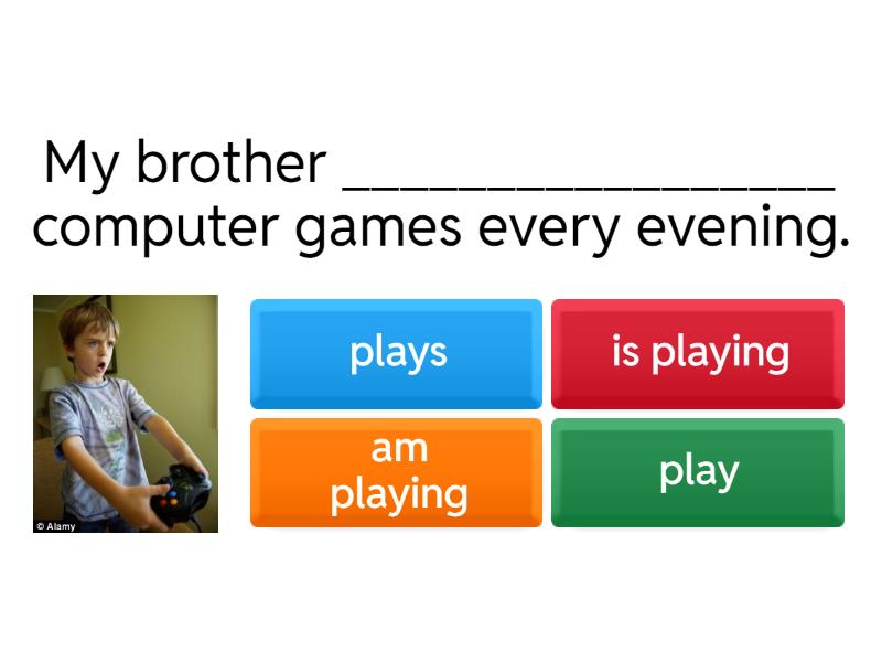 1) My brother _________________ computer games every evening.  a) plays b) is playing c) am playing d) play 2) My dad ________________ a book about animation films at the moment. a) read b) reads c) is reading d) reading 3) We ___________________ now. We ____________________ TV. a) don't cook / are watching b) don't cook / watch c) aren't cooking / are watching d) aren't cooking / watch 4) Anton often ___________________ to music at the weekend. a) listens b) is listening c) listen d) listening 5) My mum and dad usually ________________ dancing on Saturdays. a) goes b) are going c) go d) is going 6) Our school football team _______________________ their big match now. a) play b) plays c) are playing d) is playing 7) __________ John ________ basketball every Friday after school? a) Is John playing .... b) Do John play ....... c) Does John play ..... d) Does John playing ..... 8) You ________________ your homework these days. a) don't do b) aren't doing c) not doing d) doesn't do 9) My mum _____________ in a shop every weekend. a) works b) work c) is working d) working 10) My sister and I always ________________ milk in the morning.  a) am drinking b) drinks c) drink d) are drinking