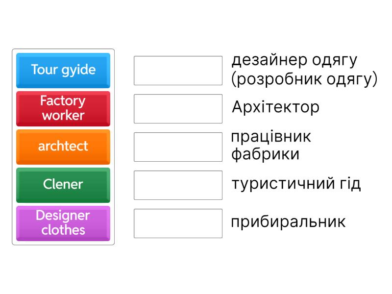 archtect - Архітектор, Factory worker - працівник фабрики, Tour gyide - туристичний гід, Clener - прибиральник, Designer clothes - дезайнер одягу (розробник одягу),