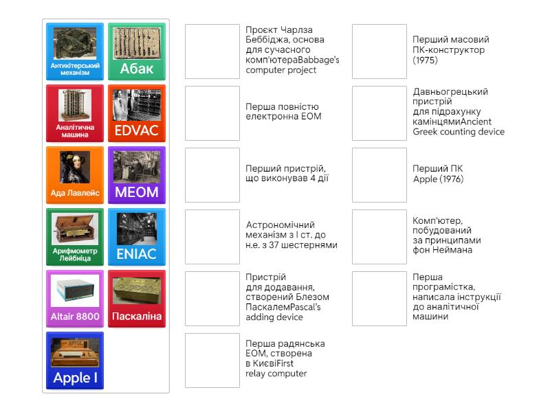 Абак - Давньогрецький пристрій для підрахунку камінцямиAncient Greek counting device, Аналітична машина - Проєкт Чарлза Беббіджа, основа для сучасного комп’ютераBabbage's computer project, Ада Лавлейс - Перша програмістка, написала інструкції до аналітичної машини, Паскаліна - Пристрій для додавання, створений Блезом ПаскалемPascal's adding device, Арифмометр Лейбніца - Перший пристрій, що виконував 4 дії, Антикітерський механізм - Астрономічний механізм з І ст. до н.е. з 37 шестернями, ENIAC - Перша повністю електронна ЕОМ, EDVAC - Комп’ютер, побудований за принципами фон Неймана, МЕОМ - Перша радянська ЕОМ, створена в КиєвіFirst relay computer, Altair 8800 - Перший масовий ПК-конструктор (1975), Apple I   - Перший ПК Apple (1976),
