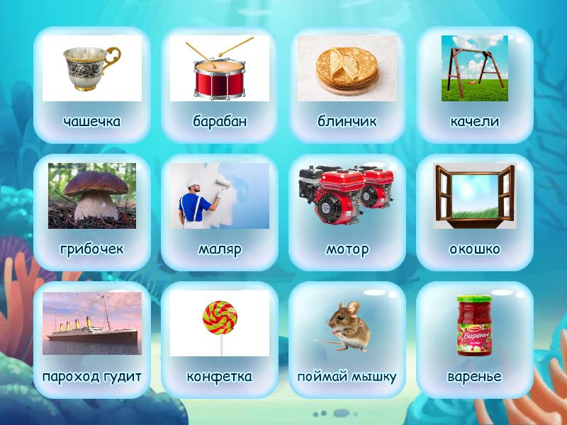 окошко - синий кит, блинчик - морской слон, маляр - морской котик, пароход гудит - пингвин, поймай мышку - буревестник, грибочек - морской леопард, чашечка - альбатрос, варенье - тюлень-крабоед, мотор - кашалот, качели - дельфин, конфетка - баклан, барабан - поморник,