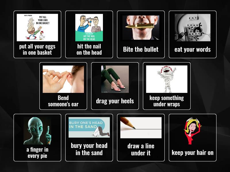 Bite the bullet - Make yourself do or accept something difficult or unpleasant, Bend someone's ear - Keep asking and questions someone in detail about something, drag your heels - deal with something slowly, because you don't want to do it., a finger in every pie - be involved in or influence many different activities, eat your words - admit that something you said was wrong, hit the nail on the head - describe exactly what is causing a problem or situation, draw a line under it - finish talking about a topic and not refer to it again, keep your hair on - stay calm and patient, put all your eggs in one basket - risk losing everything by limiting your options, keep something under wraps - keep something secret or confidential, bury your head in the sand - refuse to think about or deal with a situation,