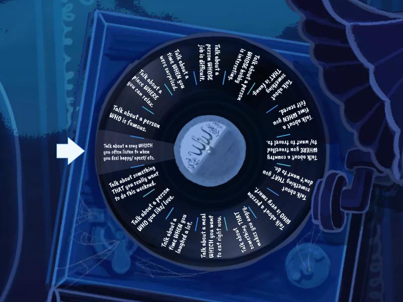 1) Talk about a person WHO is famous. 2) Talk about a place WHERE you can relax. 3) Talk about a time WHEN you were surprised. 4) Talk about a person WHOSE job is difficult. 5) Talk about a person WHOSE hobby is interesting. 6) Talk about something THAT is funny. 7) Talk about a time WHEN you felt scared.  8) Talk about a country WHERE you travelled to/ want to travel to. 9) Talk about something THAT you don't want to do. 10) Talk about a person WHO is very smart. 11) Talk about something THAT makes you angry.  12) Talk about a meal WHICH you want to eat right now. 13) Talk about a time WHEN you laughed a lot. 14) Talk about a person WHO you like/ love. 15) Talk about something THAT you really want to do this weekend. 16) Talk about a song WHICH you often listen to when you feel happy/ upset/ etc.