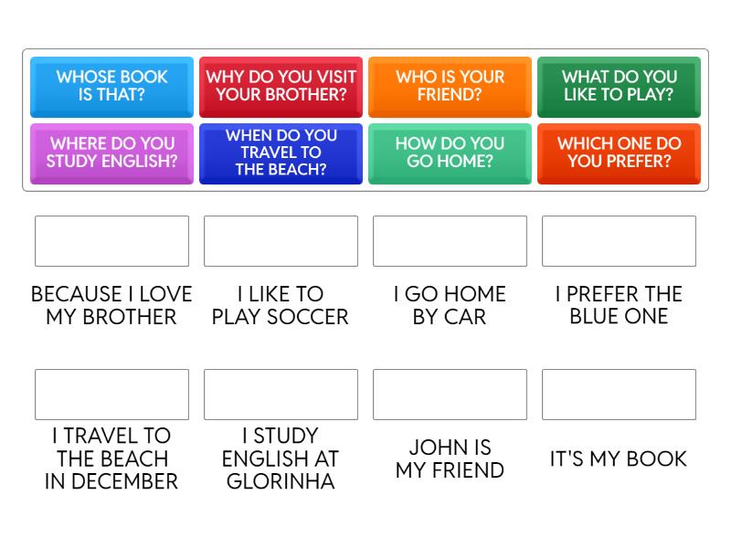 WHAT DO YOU LIKE TO PLAY? - I LIKE TO PLAY SOCCER, WHERE DO YOU STUDY ENGLISH? - I STUDY ENGLISH AT GLORINHA, WHEN DO YOU TRAVEL TO THE BEACH? - I TRAVEL TO THE BEACH IN DECEMBER, HOW DO YOU GO HOME? - I GO HOME BY CAR, WHICH ONE DO YOU PREFER? - I PREFER THE BLUE ONE, WHY DO YOU VISIT YOUR BROTHER? - BECAUSE I LOVE MY BROTHER, WHOSE BOOK IS THAT? - IT'S MY BOOK, WHO IS YOUR FRIEND? - JOHN IS MY FRIEND,