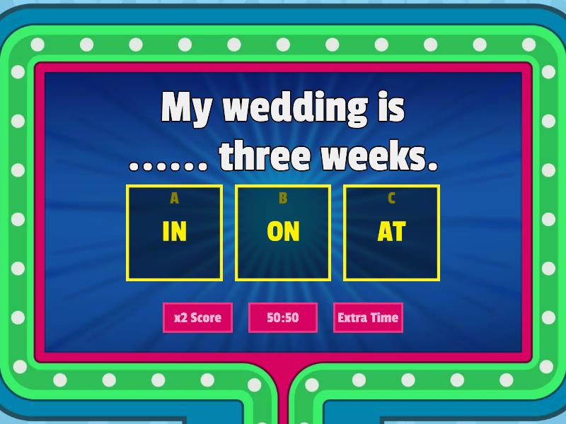 1) My wedding is ...... three weeks. a) IN b) ON c) AT 2) Do you go to the cinema ....... the weekend? a) IN b) ON c) AT 3) My grandmother was born ...... 1940 a) IN b) ON c) AT 4) I go to bed ...... midnight a) IN b) ON c) AT 5) She has classes ...... Saturday a) IN b) ON c) AT 6) Do you work ..... the evening? a) IN b) ON c) AT 7) My birthday is ...... January a) IN b) ON c) AT 8) Holidays begin ...... Saturday. a) IN b) ON c) AT 9) Het gets up ...... 8 o'clock everyday a) IN b) ON c) AT 10) My English class starts ...... 7 pm. a) IN b) ON c) AT 11) He drinks coffee ..... the mornings. a) IN b) ON c) AT 12) My birthday is ..... December. a) IN b) ON c) AT 13) We go to the beach ...... Summer a) IN b) ON c) AT 14) The course starts ...... November. a) IN b) ON c) AT 15) What do you do ...... Wednesday? a) IN b) ON c) AT 16) I visit my parents ...... Christmas a) IN b) ON c) AT 17) Music was great ...... the 60's a) IN b) ON c) AT 18) We live ...... the 21st century a) IN b) ON c) AT