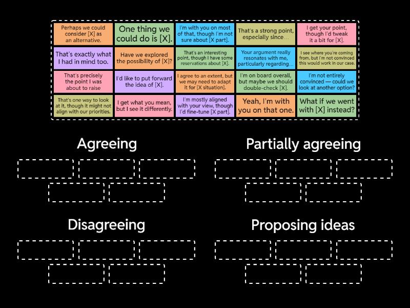 Agreeing: That’s a strong point, especially since…, That’s precisely the point I was about to raise, Your argument really resonates with me, particularly regarding…, That’s exactly what I had in mind too., Yeah, I’m with you on that one., Partially agreeing: I agree to an extent, but we may need to adapt it for [X situation]., I’m mostly aligned with your view, though I’d fine-tune [X part]., I get your point, though I’d tweak it a bit for [X]., I’m on board overall, but maybe we should double-check [X]., I’m with you on most of that, though I’m not sure about [X part]., Disagreeing: I see where you’re coming from, but I’m not convinced this would work in our case., That’s one way to look at it, though it might not align with our priorities., I get what you mean, but I see it differently., I’m not entirely convinced — could we look at another option?, That’s an interesting point, though I have some reservations about [X]., Proposing ideas: Have we explored the possibility of [X]?, I’d like to put forward the idea of [X]., Perhaps we could consider [X] as an alternative., What if we went with [X] instead?, One thing we could do is [X].,