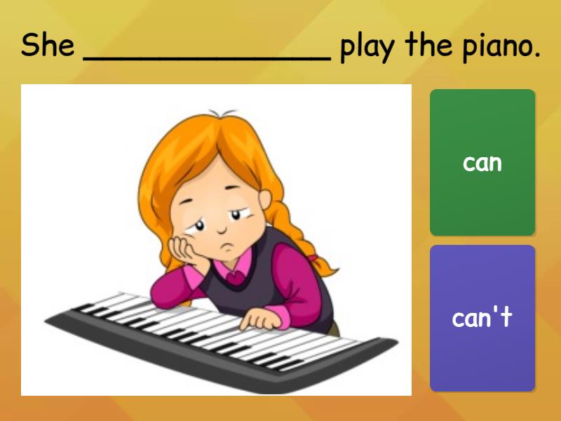 1) She _____________ play the piano.  a) can b) can't 2) He _____________ swim. a) can't b) can 3) He ____________ play soccer. a) can b) can't 4) She ___________ cook. a) can't b) can 5) She __________ watch TV. a) can b) can't 6) He ___________ ride a bike. a) can't b) can