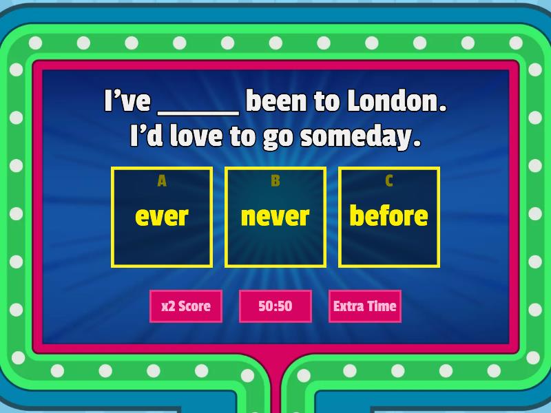 1) I've ______ been to London. I'd love to go someday. a) ever b) never c) before 2) Have you ______ tried sushi? a) never b) ever c) only 3) I've seen this movie ______. I don't want to watch it again. a) ever b) never c) before 4) She has ______ had one job in her whole life. a) before b) never c) only 5) We have ______ played this song on the piano. It's a first for us. a) before b) ever c) only