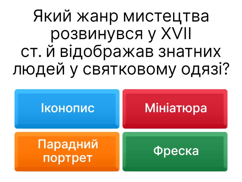 1) Який жанр мистецтва розвинувся у XVII ст. й відображав знатних людей у святковому одязі? a) Іконопис b) Мініатюра c) Парадний портрет d) Фреска 2) Яка особливість парадних портретів XVII ст.? a) Зображення природи b) Виключно духовні сюжети c) Зображення простих селян d) Підкреслення багатства, влади і статусу людини 3) Які матеріали найчастіше використовувалися в архітектурі XVII ст.? a) Мармур і золото b) Камінь, цегла і дерево c) Скло і бетон d) Лише цегла 4) Яке призначення мали бастіонні системи у будівництві фортифікацій? a) Для прикрашання міст b) Для торгівлі c) Для захисту від гарматного вогню ворога d) Для складування зброї 5) Які споруди називали «фортецями-храмами»? a) Школи й академії b) Замки магнатів c) Будинки братств d) Храми та монастирі з елементами оборони 6) Які приклади замкової архітектури першої половини XVII ст. відомі? a) Київський замок b) Жовківський та Бережанський замки c) Хотинська фортеця d) Кам’янець-Подільський замок 7) Що поєднувалося у церковному будівництві XVII ст.? a) Лише готика b) Східні та античні стилі c) Європейський ренесанс і українські традиції d) Лише бароко 8) Хто часто зображався на стінах храмів XVII ст.? a) Святі b) Учні братських шкіл c) Ремісники d) Меценати – замовники храму 9) Які музичні твори відображали подвиги козаків і боротьбу з ворогами? a) Думи b) Псалми c) Канти d) Гімни 10) Хто виконував думи у XVII ст.? a) Кобзарі та лірники під акомпанемент кобзи, бандури чи ліри b) Поети й літописці c) Шляхта d) Учні академій