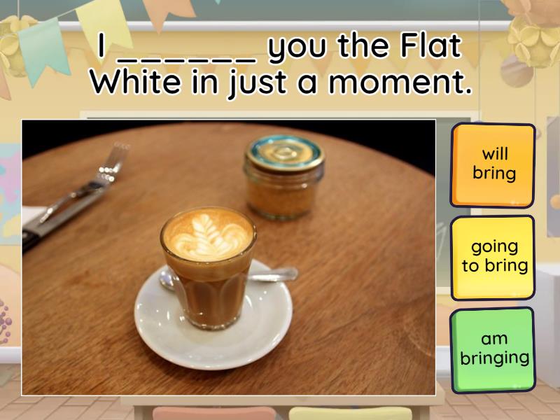 1) I ______ you the Flat White in just a moment. a) will bring b) going to bring c) am bringing 2) We ______ add a new flavor of smoothie to the menu next week. a) will b) going to c) am bringing 3) The kitchen ______ the Chicken Milanese special tonight. a) will prepare b) going to prepare c) is preparing 4) I ______ if we still have gluten-free bread. a) will check b) am going to check c) am checking 5) They ______ the Island Breeze without turmeric. a) will try b) are going to try c) are trying 6) We ______ opening earlier this Saturday for brunch. It's already on the web page. a) will open b) are going to open c) are opening 7) I ______ you an extra plate for sharing. a) will get b) am going to get c) am getting 8) The barista ______ your Cappuccino with almond milk. It's almost ready. a) will make b) is going to make c) is making 9) The manager ______ the tables our stations this afternoon. It was in our staff calendar. a) will visit b) is going to visit c) is checking 10) I ______ the kitchen about the Tzatziki Salmon right now.  a) will ask b) am going to ask c) am asking 11) We ______ more Cesar Salads during lunchtime tomorrow. We have everything prepared. a) will serve b) are going to serve c) are serving 12) We ______ the Dessert of the Day later in the evening. We have a big event. a) will serve b) are going to serve c) are serving 13) I ______ you the check once you're ready. a) will bring b) am going to bring c) am bringing 14) The kitchen ______ more chicken wraps for the lunch rush. We have many orders. a) will prepare b) are going to prepare c) is preparing 15) We ______ the bread for the Grilled Cheese to sourdough soon.  a) will change b) are going to change c) are changing