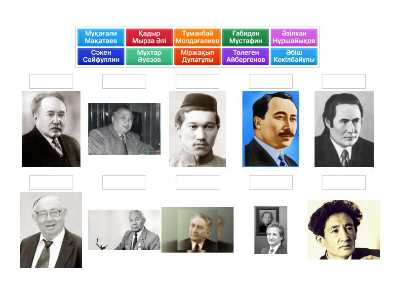 Әбіш Кекілбайұлы, Төлеген Айбергенов, Әзілхан Нұршайықов, Міржақып Дулатұлы, Мұхтар Әуезов, Мұқағали Мақатаев, Сәкен Сейфуллин, Қадыр Мырза Әлі, Тұманбай Молдағалиев, Ғабиден Мұстафин,