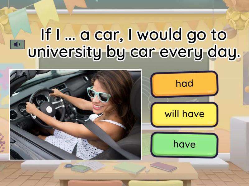 1) If I ... a car, I would go to university by car every day.  a) had b) will have c) have 2) If I won the lottery, I ... myself an apartment.  a) buy b) would buy c) bought 3) If I ... you, I would go to the doctor immediately. a) were b) was c) am 4) What would you do if you... a wallet full of money on the street? a) found b) find c) would find 5) I ... forgive Sophie if I were you. a) wouldn't b) won't c) will 6) If I were not busy, I .... to Brenda's party tonight. a) would go b) will go c) go 7) If I were you, I ... Kevin the truth.  a) will tell b) would tell c) tell 8) What would you do if you … a snake in the classroom? a) see b) saw c) did see 9) If I ... time, I would help you.  a) have b) had c) will have 10) If I were you, I ... that hat. a) buy b) bought c) wouldn't buy 11) If I ... in my English class now, I would be watching TV with my family. a) wasn't b) weren't c) am not 12) If I met Aladdin's genie, I ... him for 100 wishes. a) would ask b) will ask c) ask 13) If I ... the president, I would end up with corruption. a) were b) was c) would be 14) If I got a PS4 for my birthday, I ... the happiest man on Earth. a) were b) would be c) will be